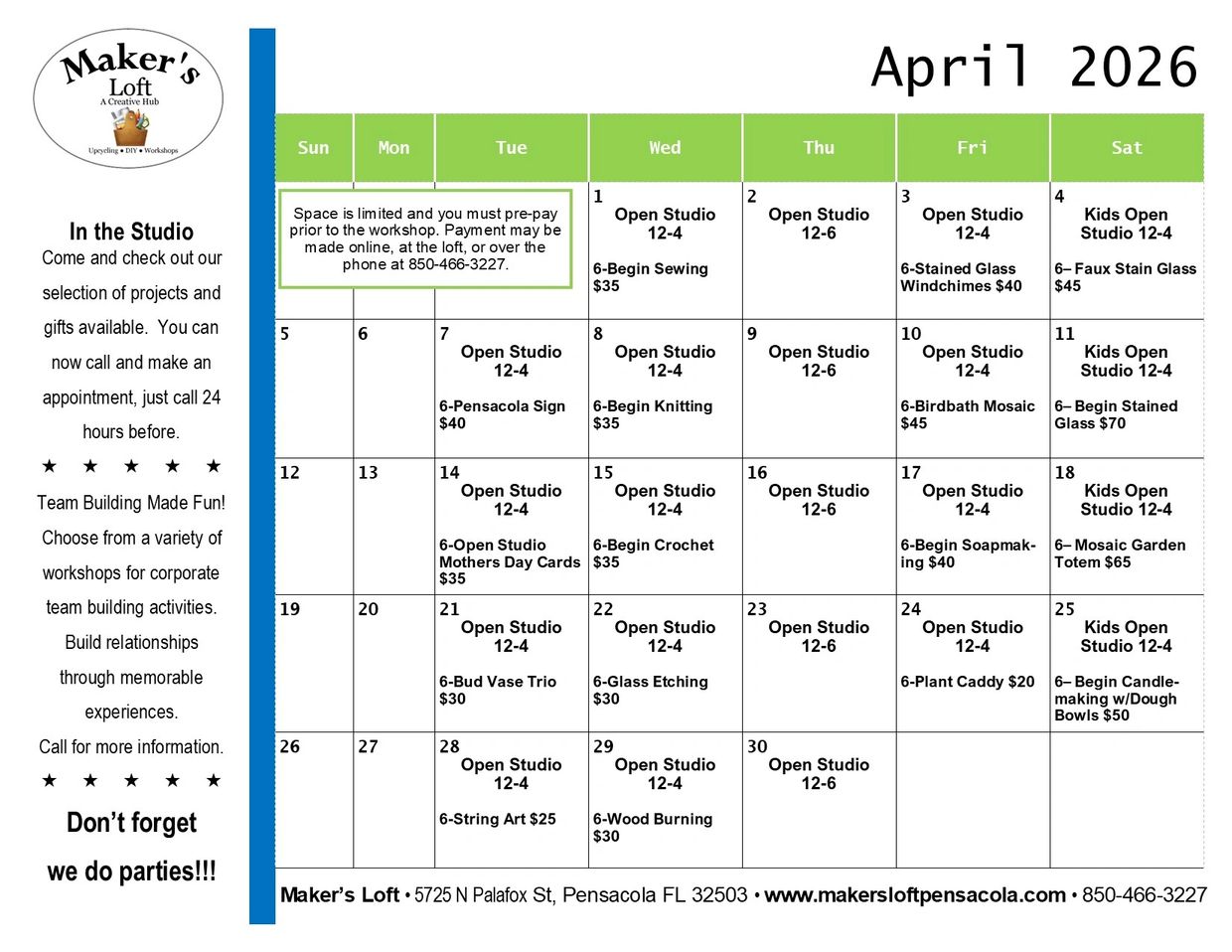 All workshops require an appointment, please call us to schedule at 850-466-3227